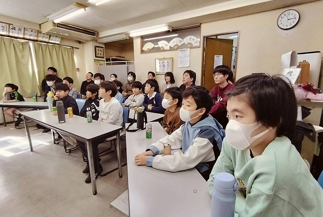 ▲真剣な表情で聞き入る両国将棋塾生たち
