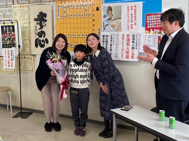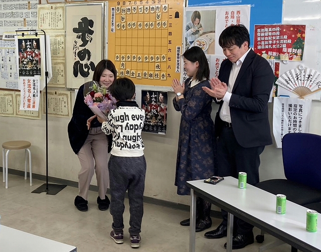 ▲両国教室生より西山朋佳女流三冠へ、お祝いの花束贈呈