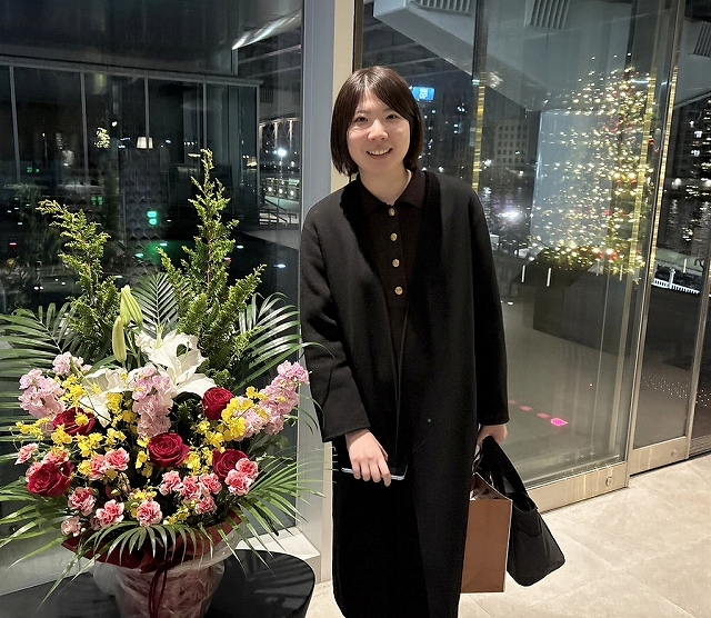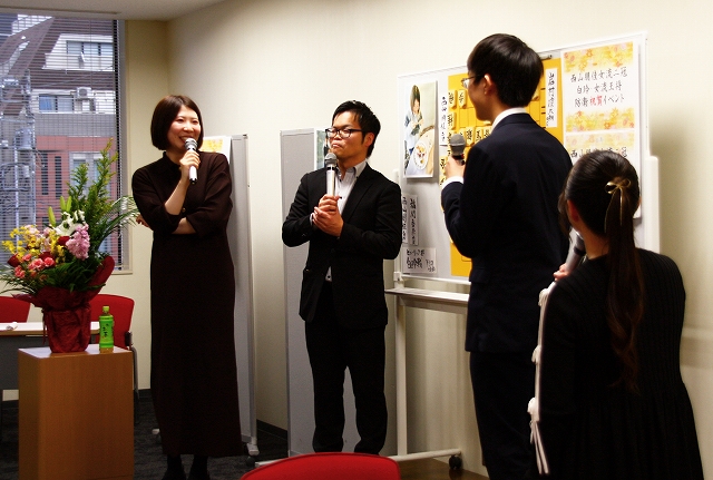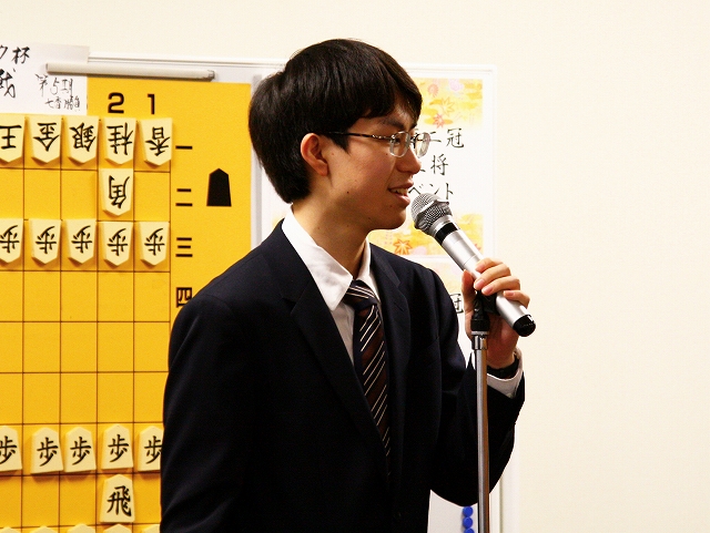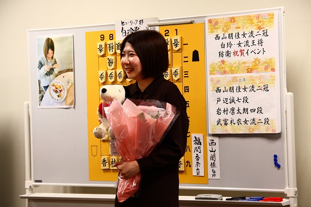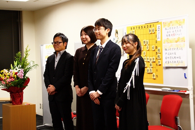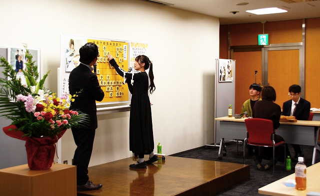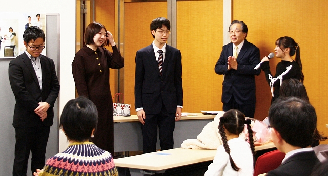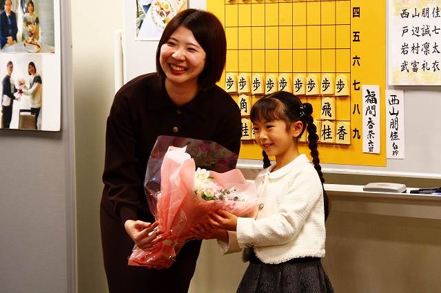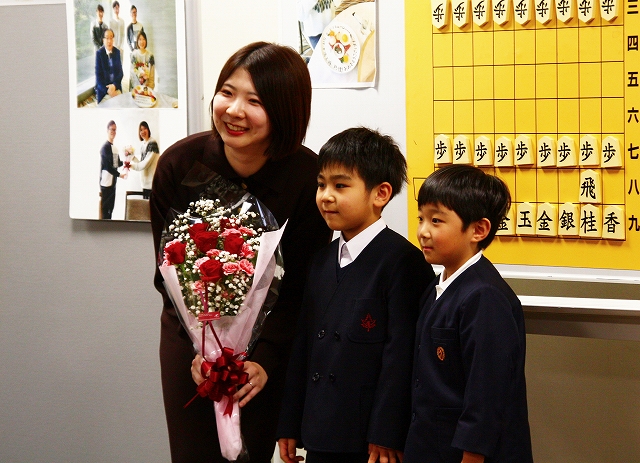 ▲将棋教室の子供たちより、二冠防衛のお祝い花束贈呈
