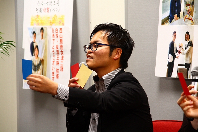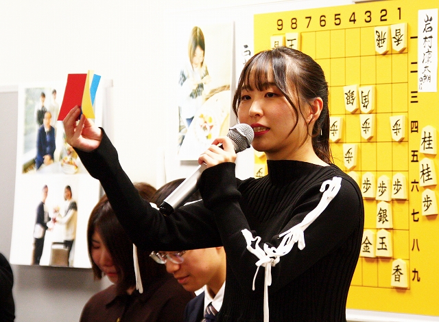 ▲お客様には西山女流が出題する三択問題に3色の色紙でご参加いただきました